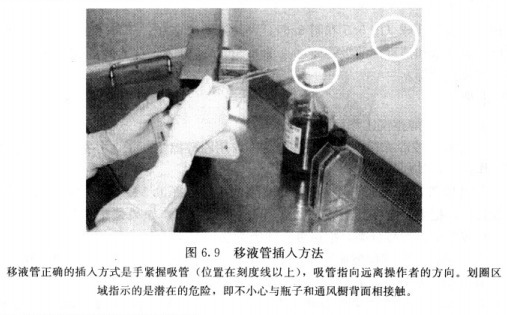 (a)如果是玻璃吸管,從盒中取出吸管時.要保持待取吸管在盒中與其他吸管平行,并盡叮能少地接觸他們,特別是吸管頭部,如果拿著的吸管接觸了其他仍在盒內(nèi)的吸管尾端.則不能再使用它;把吸管插人移液器中,吸竹指向你的外側(cè),握在刻度上面部分,這樣,吸管進(jìn)人試劑瓶或培養(yǎng)瓶的部分將不會被污染(圖6.9).