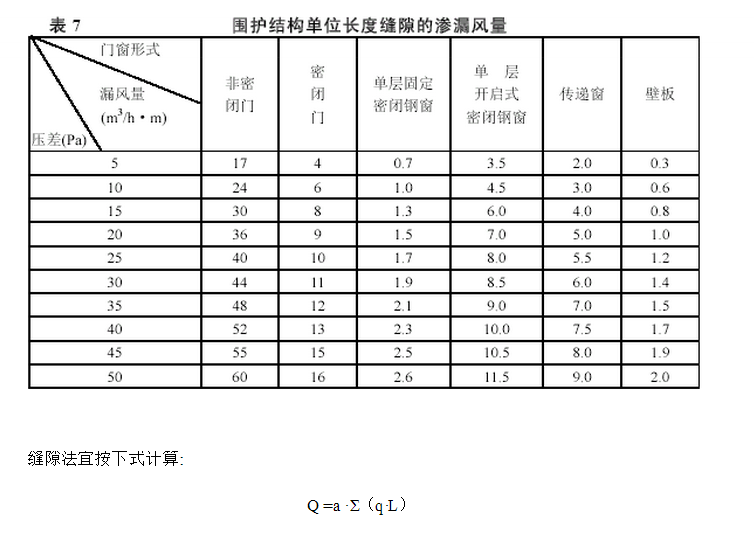 1 選用縫隙法來核算滲漏風(fēng)量,既思考了潔凈室圍護結(jié)構(gòu)的氣密性,又思考了室內(nèi)保持不一樣的壓差值所需的正壓風(fēng)量。因而,縫隙法比按房間的換氣次數(shù)預(yù)算法較為合理和準確。 單位長度縫隙滲漏空氣量用公式核算是對比艱難的,一般是經(jīng)過不一樣型式的門、窗進行屢次實驗的數(shù)據(jù)核算后得出的。表 7是對G內(nèi)潔凈室的 20多種常用的門、窗在實驗室進行了很多的實驗,獲得的數(shù)據(jù),盡管這些年潔凈室門窗的資料和型式有很大的開展,但現(xiàn)在還有有些潔凈室依然選用鋼制密封門窗。故表中數(shù)據(jù)仍可供規(guī)劃時參閱。