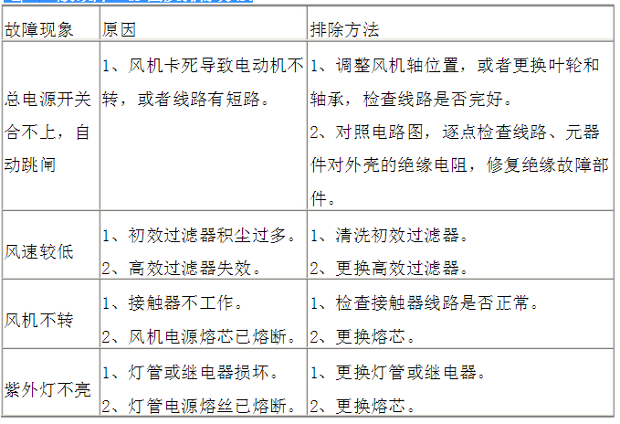 4、更換高效空氣過(guò)濾器時(shí),應(yīng)注意型號(hào)規(guī)格尺寸的正確(原生產(chǎn)廠家配置),按箭頭風(fēng)向裝置,并應(yīng)注意過(guò)濾器的周邊密封,**無(wú)滲漏現(xiàn)象發(fā)生。 七、一般故障、原因及排除方法